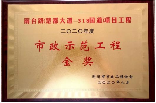 近日,由武漢建工路橋分公司承建的雨臺(tái)路(楚都大道-318國(guó)道)項(xiàng)目、福陽路(雞公山路-濱河路)項(xiàng)目,分別獲評(píng)“2020年度荊州市市政示范工程金獎(jiǎng)”。